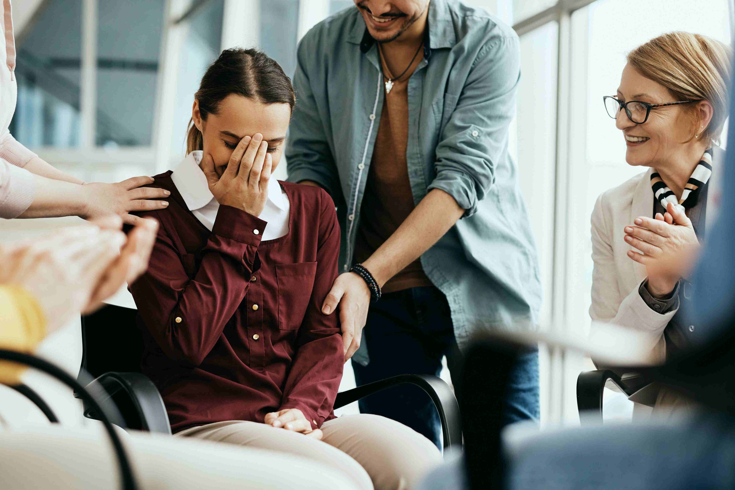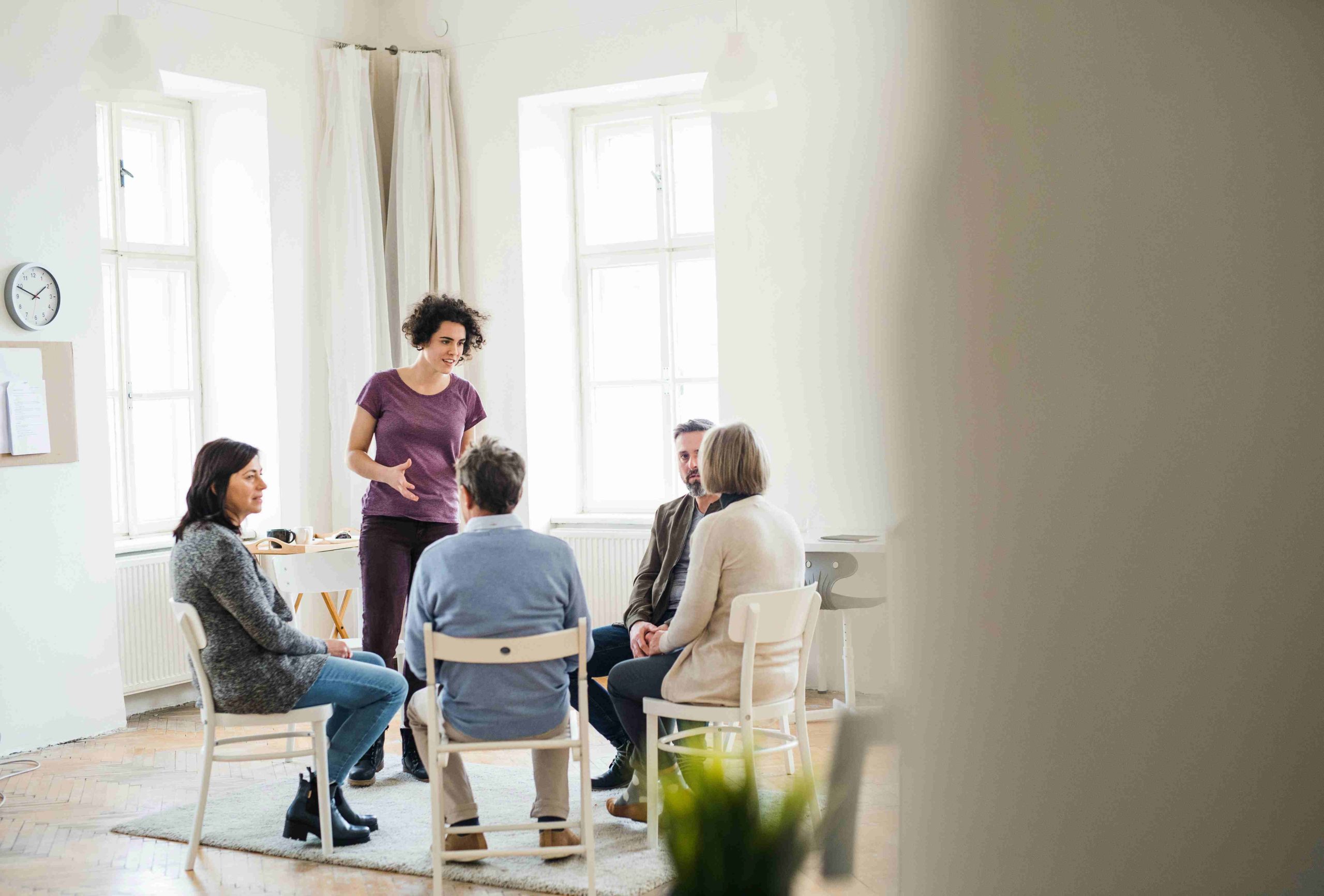 Group therapy creates a supportive environment where individuals come together to share their experiences, connect with others, and grow through guided conversations led by a qualified therapist.